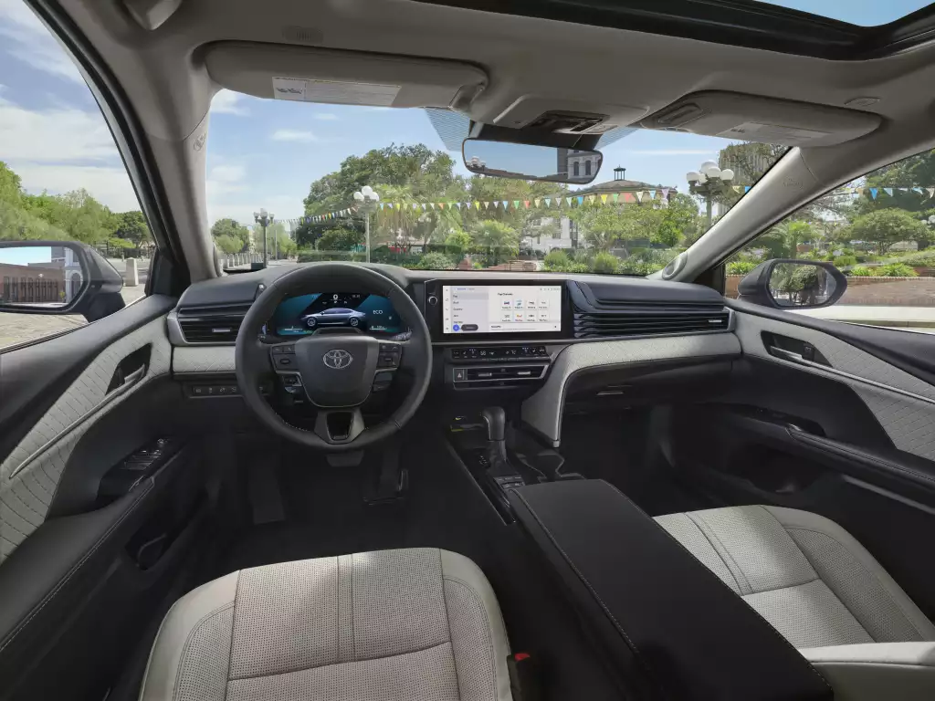 کابین تویوتا کمری هیبرید ۲۰۲۵، با تمرکز بر راحتی، لوکس بودن و فناوری، محیطی مدرن را فراهم میکند. صندلیهای چرمی با دوخت دقیق و طراحی ارگونومیک، همراه با تنظیم برقی و گرمکن و سردکن، راحتی فوقالعادهای را برای سرنشینان به ارمغان میآورند. داشبورد خودرو از مواد باکیفیت ساخته شده و نمایشگر دیجیتال پشت فرمان، اطلاعات کلیدی را با وضوح بالا ارائه میدهد. صفحه نمایش لمسی مرکزی ۱۲.۳ اینچی با قابلیت اتصال به سیستمهای اندروید اتو و اپل کارپلی، همراه با سیستم ناوبری پیشرفته، مرکز کنترل هوشمند خودرو است. نورپردازی داخلی قابل تنظیم، سیستم صوتی JBL با ۹ بلندگو و سقف پانورامیک از دیگر امکانات رفاهی این خودرو هستند. فضای جادار برای سرنشینان عقب و محفظه بار بزرگ، نیازهای خانوادهها را به خوبی برآورده میکند.